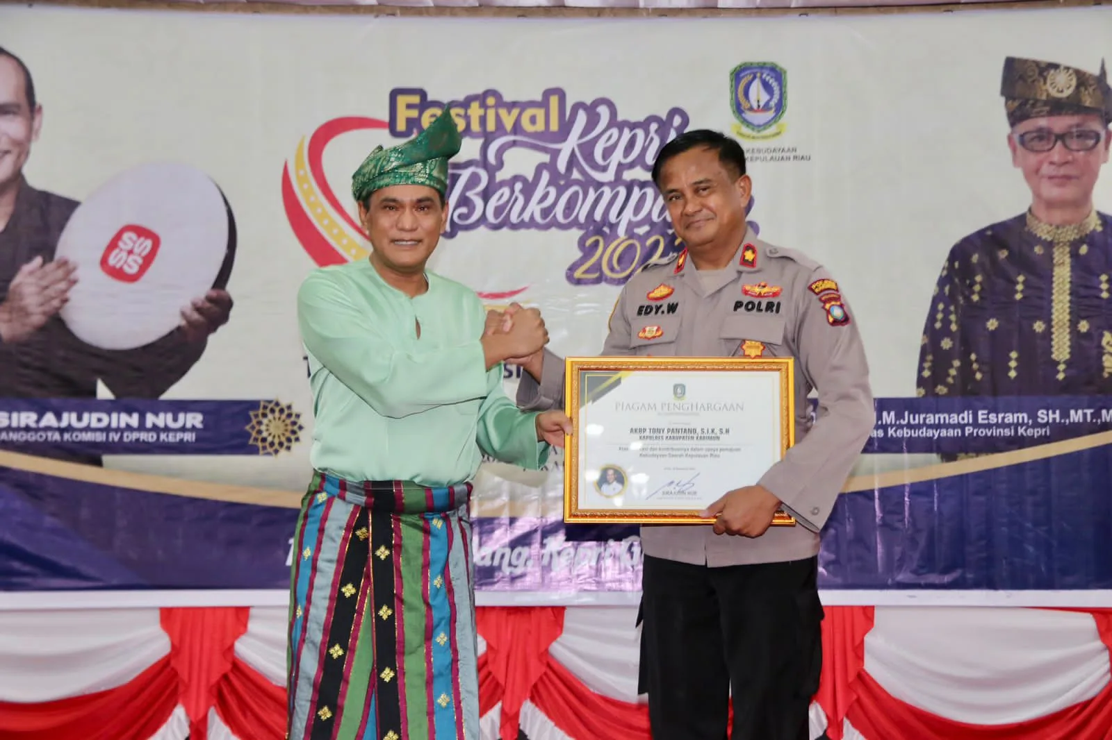 DK – Karimun – Anggota DPRD Kepulauan Riau 2 periode, Sirajudin Nur memberikan piagam penghargaan kepada Kapolres Karimun, AKBP Tony Pantano karena turut serta melestarikan kebudayaan Melayu.