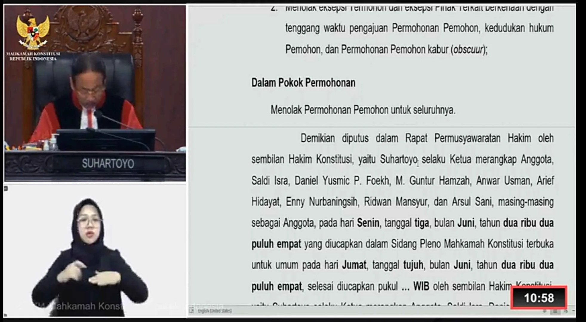 Penolakan itu tertuang dalam amar putusan yang dibaca oleh Hakim MK Suhartoyo pada sidang putusan, Jumat (07/06).