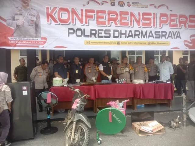 Konferensi pers digelar di lobi Mapolres Dharmasraya pada Rabu hari tanggal 5/3/2025.
