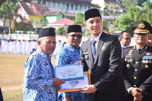 Upacara peringatan Hari Lahir Pancasila diakhiri dengan penyerahan penghargaan dan santunan kepada Aparatur Sipil Negara (ASN) Pemerintah Kota Sawahlunto yang telah memasuki masa purna bakti.