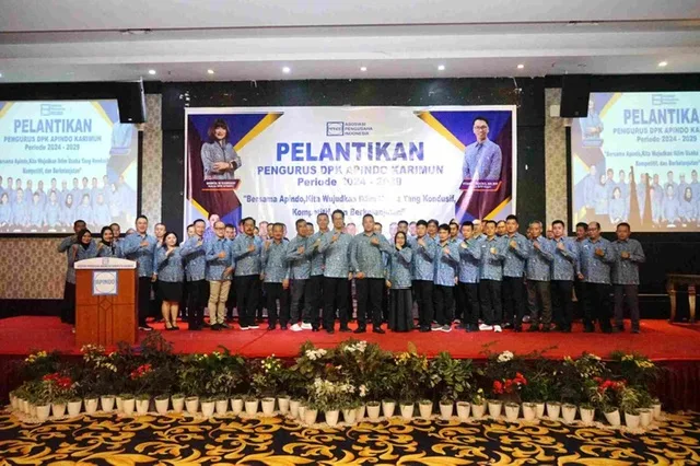 Prosesi pelantikan mengangkat tema “Bersama APINDO kita wujudkan iklim usaha yang kondusif, kompetitif, dan berkelanjutan” berlangsung di ballroom Hotel Aston Tanjung Balai Karimun.